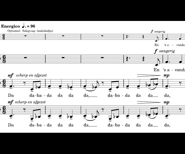 Interessante en bruikbare bewerking van het volkslied En 's avonds voor vrouwenkoor met optionele sologroep. In opdracht van Inge Sykora voor Caloroso vzw.