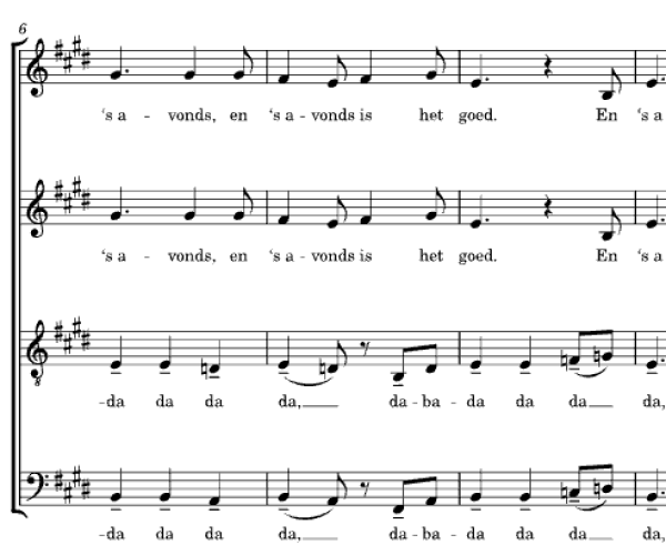 Interessante en bruikbare bewerking van het volkslied En 's avonds voor vrouwenkoor met optionele sologroep. In opdracht van Inge Sykora voor Caloroso vzw.